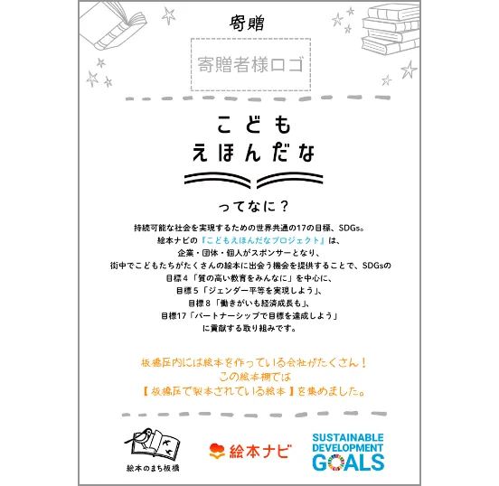絵本棚には、「絵本のまち板橋」「こどもえほんだな」ロゴ、協賛企業・団体・個人様名ロゴが入ります。