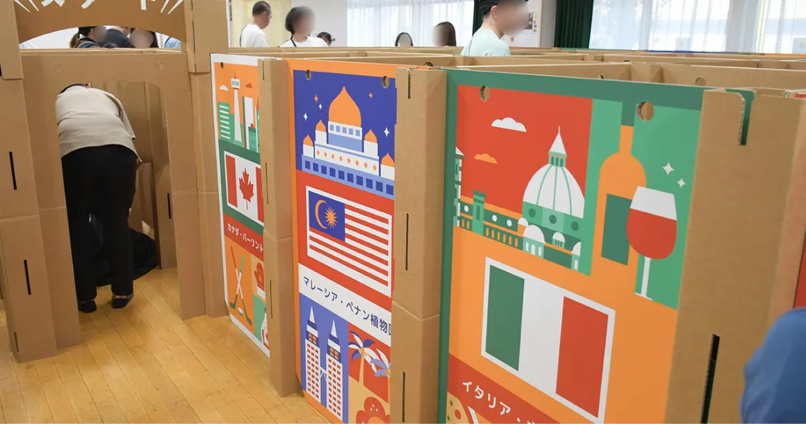 段ボールでできた迷路の中で、デジタルスタンプラリー!迷路に隠されたチェックポイントをみつけてゴールをめざそう!