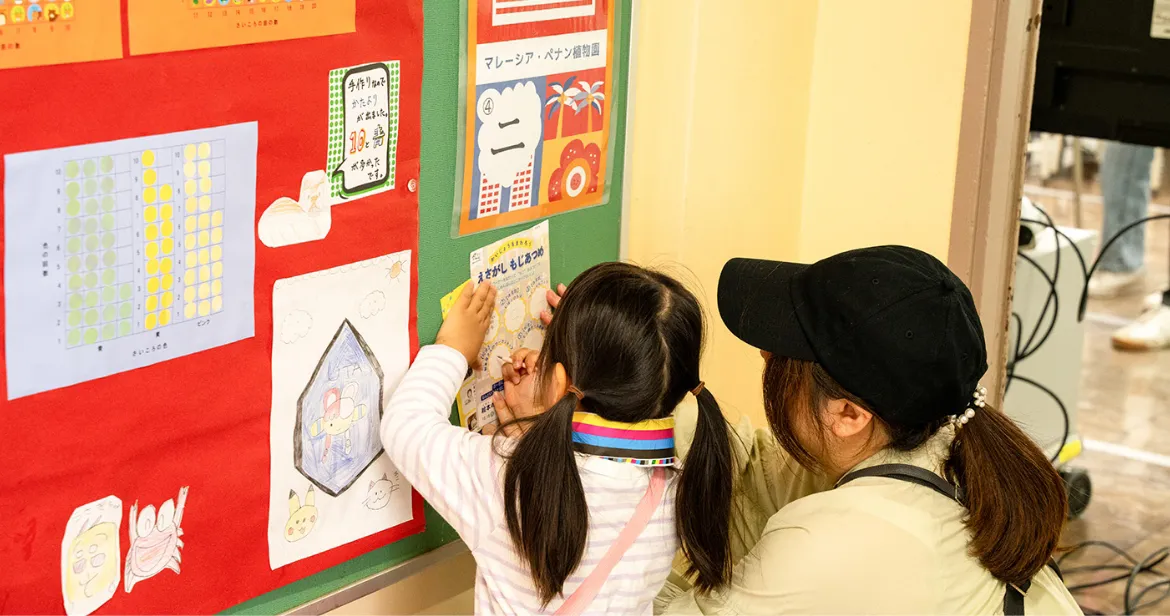 世界の絵本やおもちゃで遊んだり、「音読体操」で英語絵本をいっしょに発音してみたり、外国の言葉や文化に触れられる楽しいエリアです。