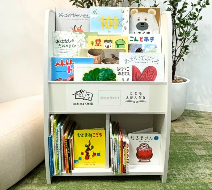 絵本棚には、「絵本のまち板橋」「こどもえほんだな」ロゴ、協賛企業・団体・個人様名ロゴが入ります。