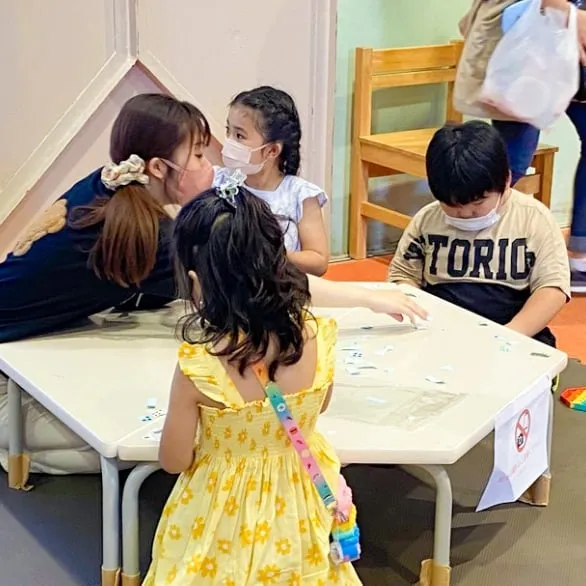 世界の絵本やおもちゃで遊んだり、「音読体操」で英語絵本をいっしょに発音してみたり、外国の言葉や文化に触れられる楽しいエリアです。