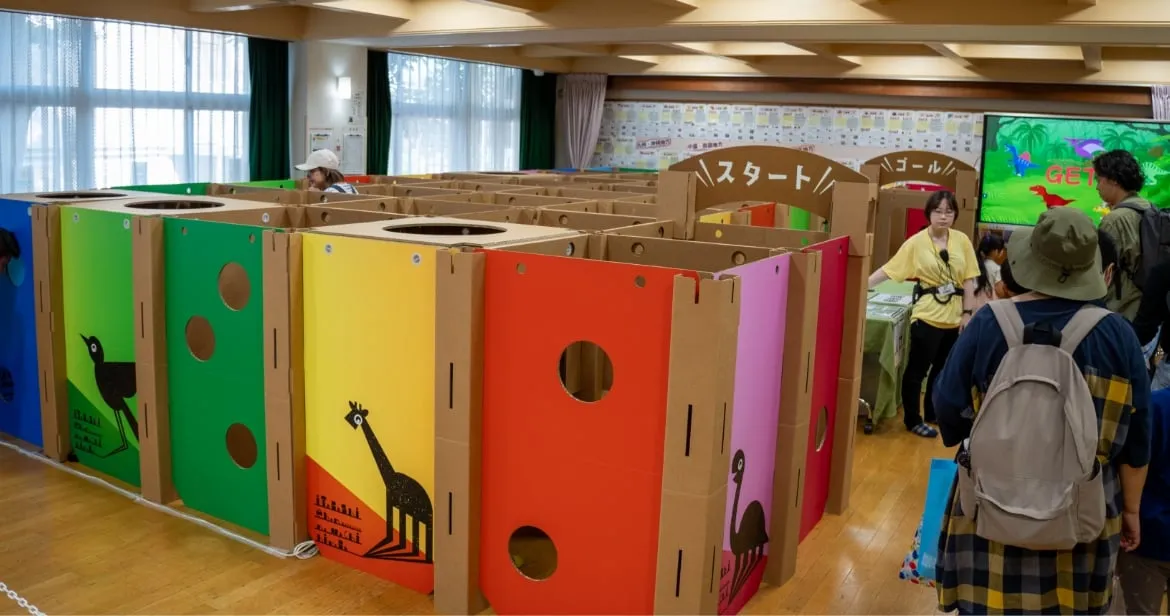 段ボールでできた迷路の中で、デジタルスタンプラリー!迷路に隠されたチェックポイントをみつけてゴールをめざそう!