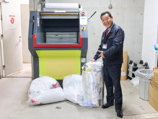 製造過程で出るゴミを、圧縮機で潰してから搬出しています。そうすることでそれまで以上にきちんと分別するようになりましたし、輸送回数が減るためCO2削減にもつながっています。
